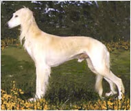 El saluki es más delgado, más ligero y algo más anguloso que el galgo. Los huesos de la cadera de los salukis suelen ser visibles, así como las tres últimas costillas y un par de vértebras. El saluki está diseñado tanto para la velocidad como para la resistencia y es el corredor de largas distancias de la familia de los lebreles. La amplia gama de estilos se refleja en el rango de alturas aceptables: de 58 a 71 cm para los machos, aunque la mayoría de los salukis actuales se encuentran en la parte superior del rango. El peso puede variar desde aproximadamente 16 a 30 kg para una hembra pequeña hasta 29 kg para un macho grande. Los salukis con plumas tienen pelo largo y sedoso en las orejas, debajo de la cola, entre los dedos y, a veces, en la parte posterior de las extremidades y debajo de la garganta; el resto del pelaje es corto y suave. Aunque la mayoría de las personas considera que el patrón distintivo del plumaje es el sello distintivo de la raza, el saluki también existe en una variedad lisa, en la que todo el pelo es corto y liso. Se permiten todos los colores y se puede encontrar casi cualquier color en la raza. |
